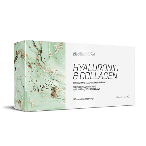 BioTechUSA Hyaluronic & Collagen è un integratore alimentare in capsule che combina collagene idrolizzato, acido ialuronico, vitamine e aminoacidi per supportare salute della pelle, idratazione dei tessuti, elasticità e struttura cutanea. La formula include anche collagene di tipo II da cartilagine, vitamina C per la sintesi di collagene e vitamina A per la salute della pelle, rendendolo un prodotto completo per il benessere estetico e strutturale.